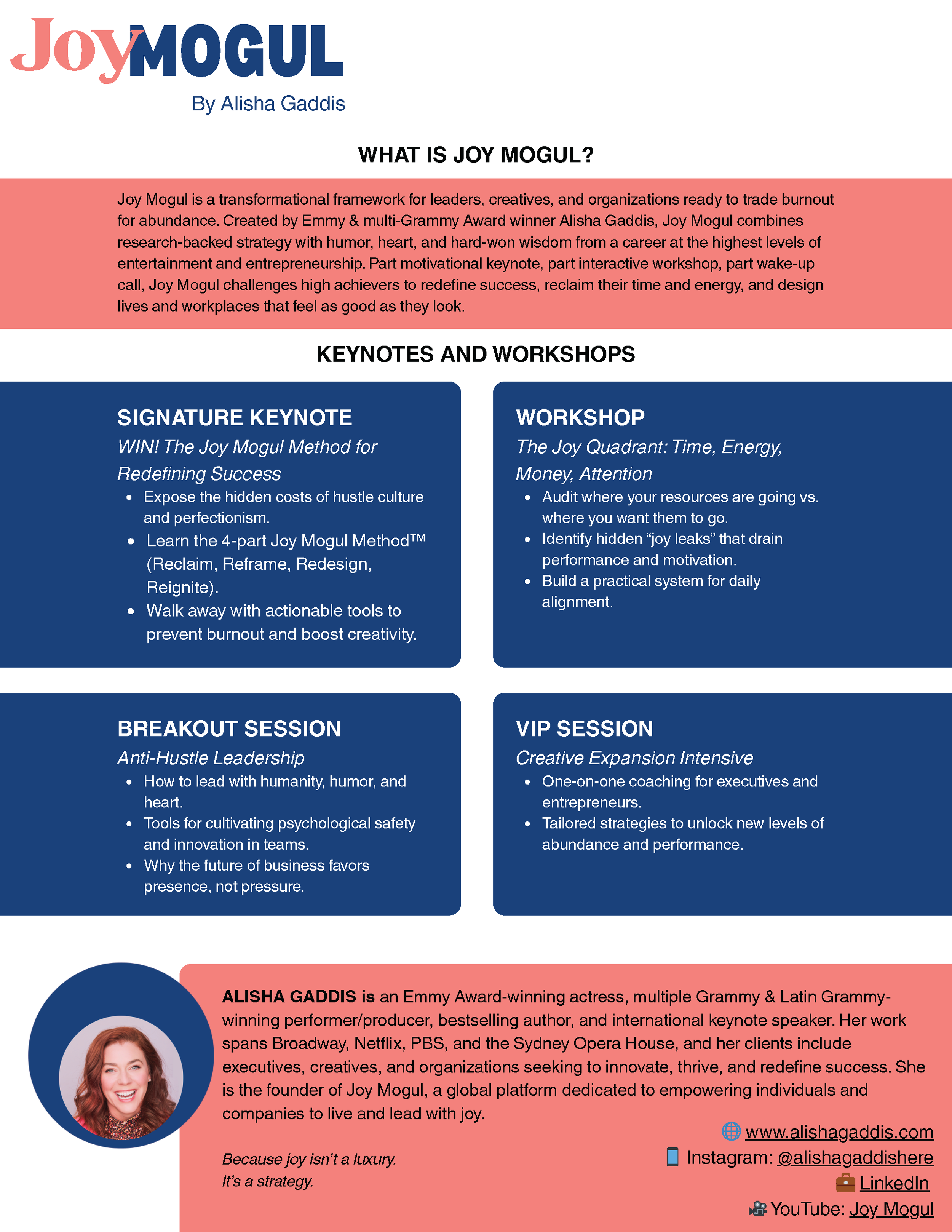 Emmy and multi-Grammy Award winner Alisha Gaddis supercharges events, retreats, and private breakthroughs with bold storytelling, real-world tools, and unapologetic heart. Whether she’s headlining a corporate workshop or coaching one-on-one, Alisha blends humor, strategy, and soul to help people step fully into their power.